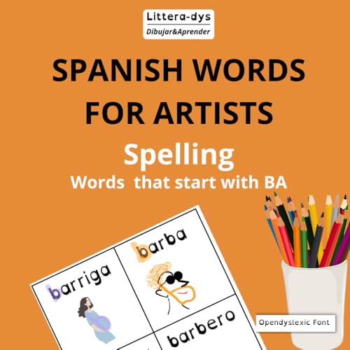 Spanish Words for Artists: Spelling. Words that start with BA: 60 words to learn spanish. Opendyslexic typography. Cream colored paper