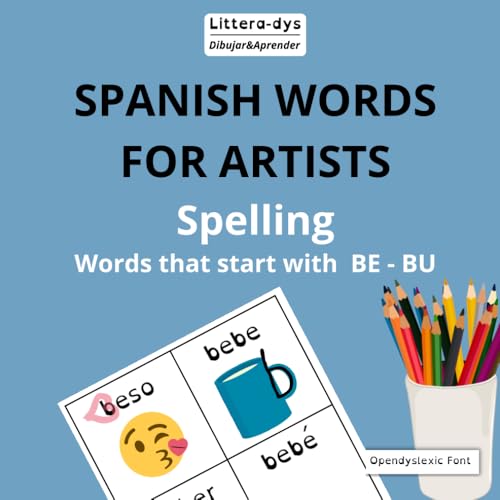 Spanish Words for Artists: Spelling. Words that start with BE - BU: 60 words to learn spanish. Opendyslexic typography. Cream colored paper