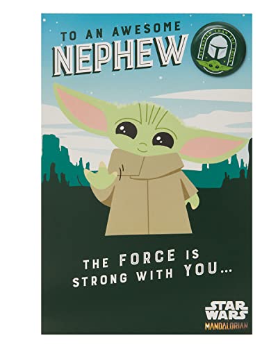 Disney The Mandalorian födelsedagskort för brorson med kuvert – barndesign med Grogu Baby Yoda och märke
