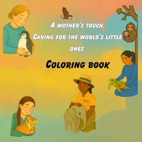 A Mother’s touch. Caring for the world’s little ones.: A coloring book with women caring for animal for children, teen, and adults, with wild small animals., dogs, cats, birds ,and landscapes