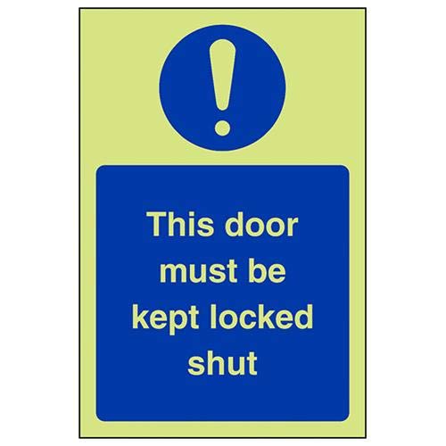 VSafety Glow In The Dark This Door Must Be Kept Låst Stängningsskylt - Porträtt - 100 mm x 150 mm - Självhäftande vinyl