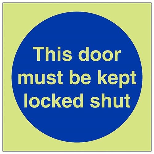 VSafety Glow In The Dark This Door Must Be Kept Låst Stängningsskylt - 200 mm x 200 mm - Stel plast