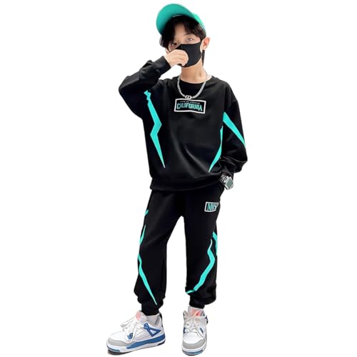 linboo träningsoverall barn pojkar kläder set 2 delar jogging kostym huvtröja och byxor sport kläder set fritidsoverall, Svart/grön, 134-140