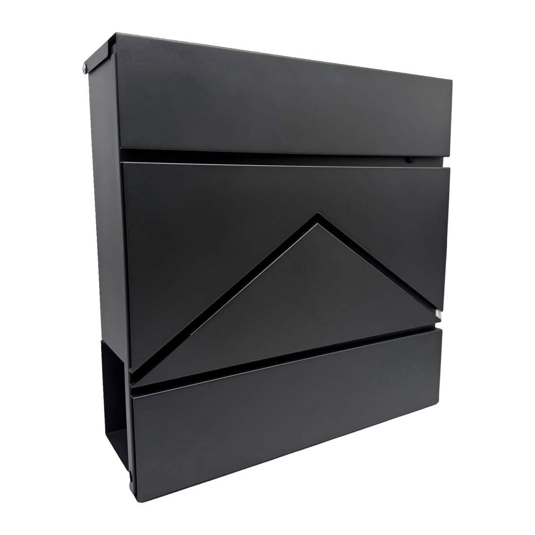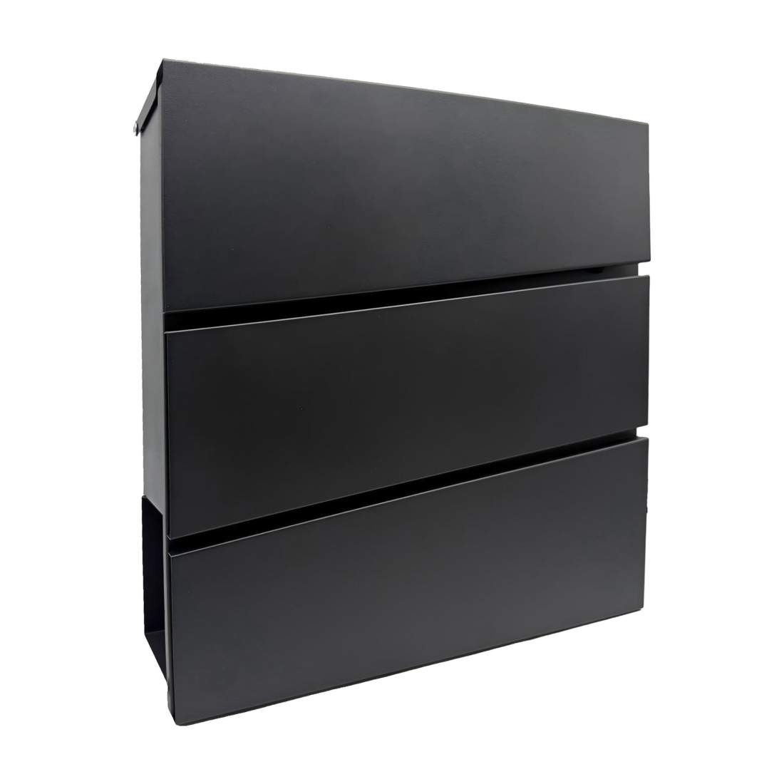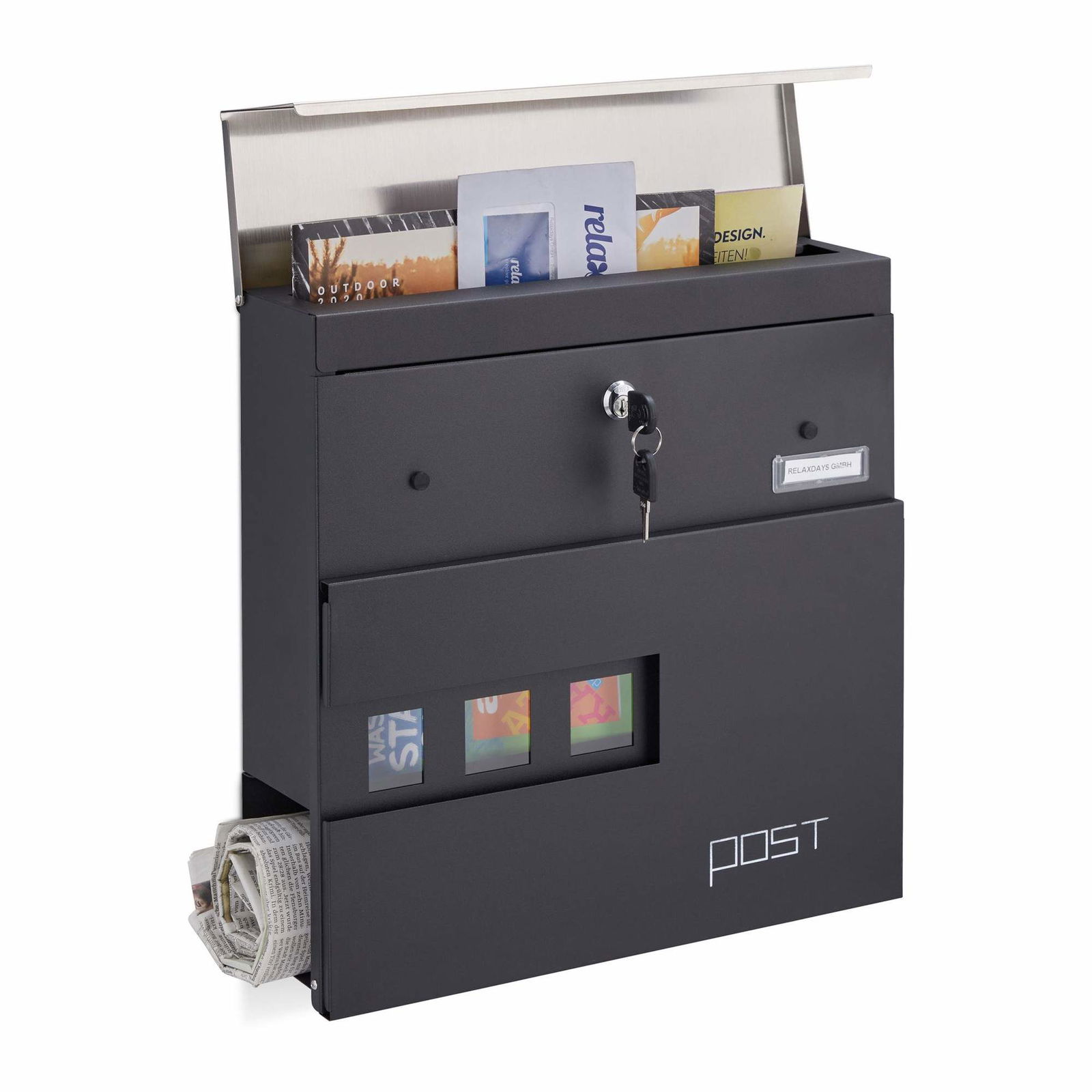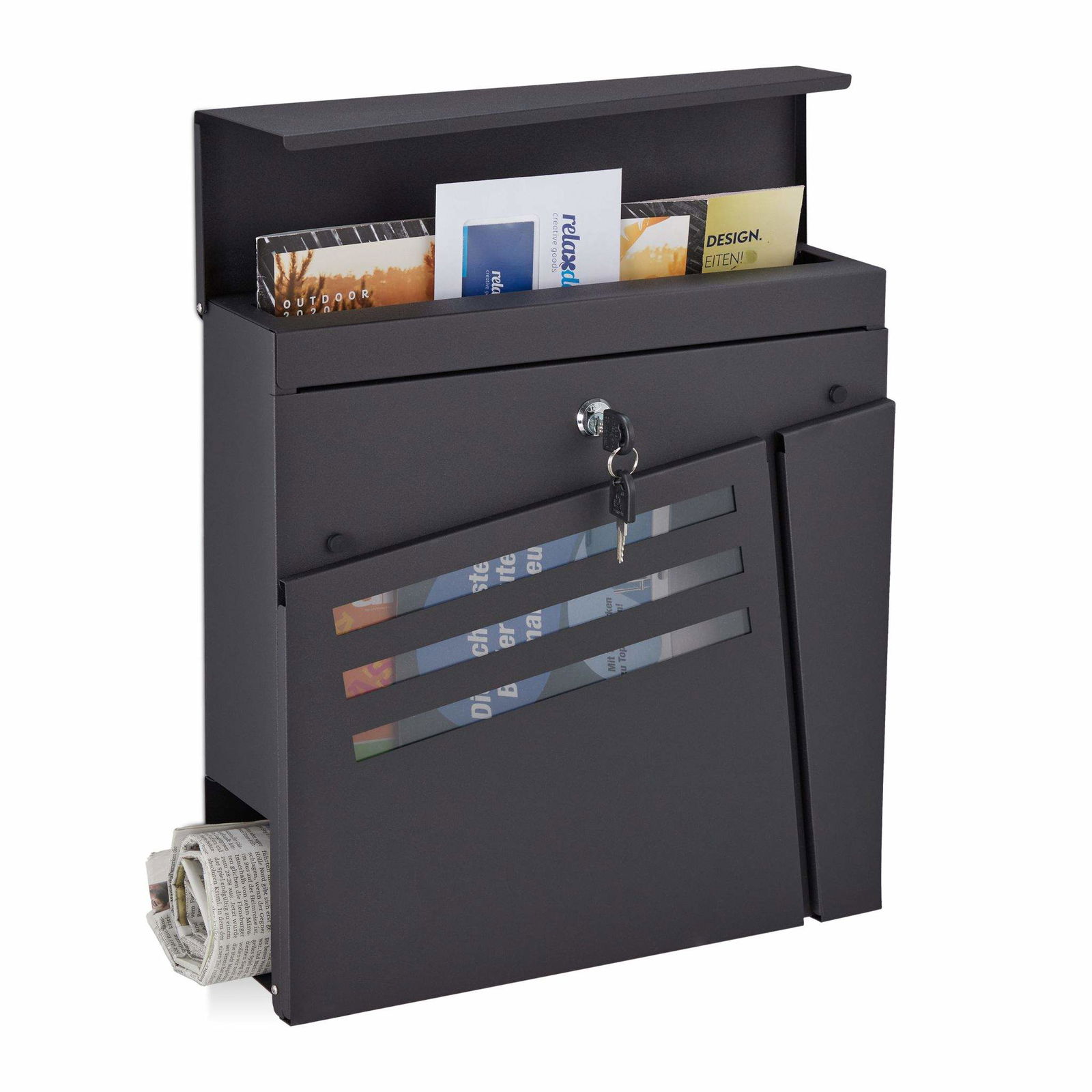 Svart stålbrevlåda med tidningshållare och nycklar