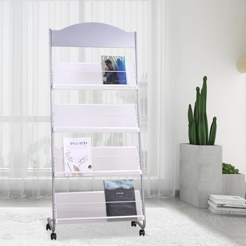 Whemyreat Svart tidningsställ broschyrställ bokställ tidningsställ, 3 ark A4 bredd litteraturstativ flygställ magasinställ tidningsställ med universella hjul (silver)