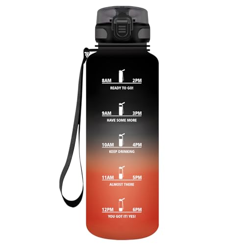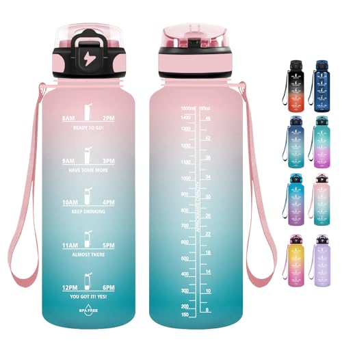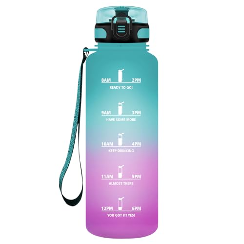 YC Kitchen 1 liter motiverande vattenflaska med tidsmarkör, läckagesäker, BPA-fri sportvattenflaska med sugrör och bärrem