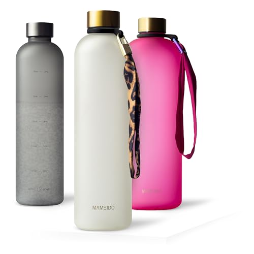MAMEIDO dricksflaska 1 l, kolsyra lämplig, läckagesäker dricksflaska med tidsmarkör som drickspåminnelse, vattenflaska BPA-fri för sport (Carbon Grey)