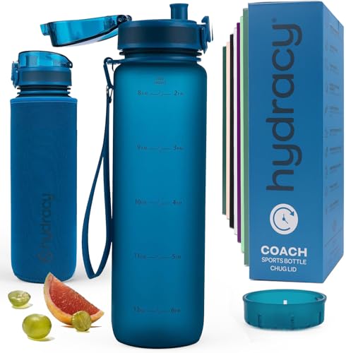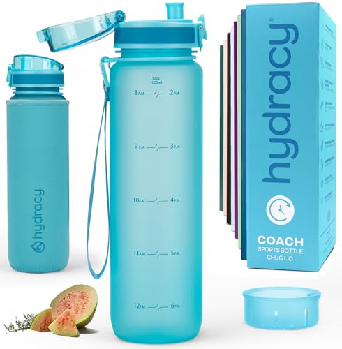 Hydracy vattenflaska med tidsmarkör - Stor 1-liters BPA-fri vattenflaska och svettfri hylsa - Läckagesäker gymflaska med fruktsil och drickstider - Perfekt för fitness, sport och utomhusbruk