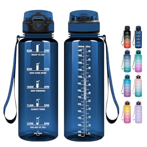 Grsta Flaska - 1 500 ml - sportflaska, BPA-fri, motiverande flaska med sugrör, vattenflaska med tidsmarkör för vandring, skola, kontor, utomhus - marinblå