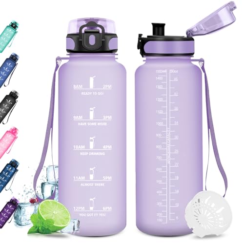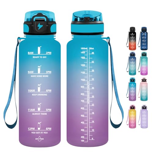 Grsta Vattenflaska - 1500 ml - Gym vattenflaska utan BPA, vattenflaska med sugrör, sportflaska med motiverande tidsmarkör, för studior, fitness, skola, kontor - blålila
