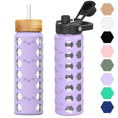 HYDRAGLAZIC 700 ml Vattenflaska i glas med sugrör och lock, glasvattenflaska med handtag, silikonhylsa med tidsmarkör, BPA-fri, lila