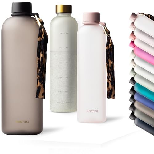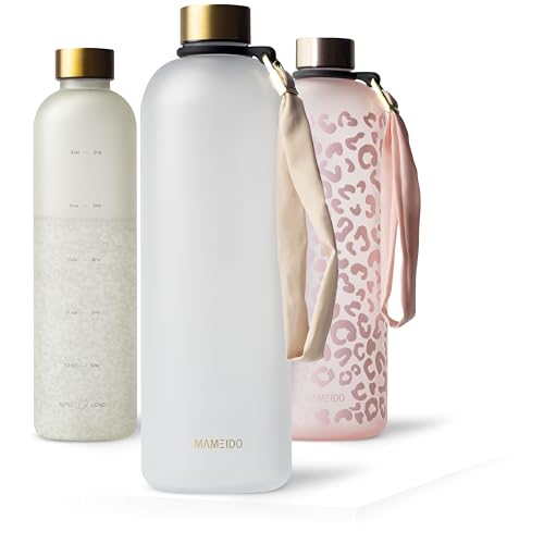 MAMEIDO dricksflaska 1l - kolsyra lämplig, läckagesäker dricksflaska med tidsmarkör som drickspåminnelse, vattenflaska BPA-fri för sport (Frosted White Gold, 1000ml)