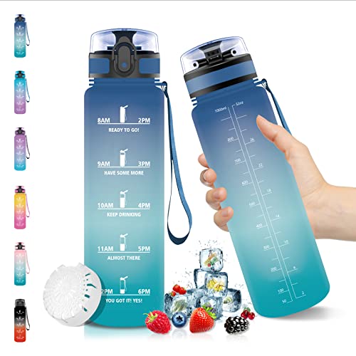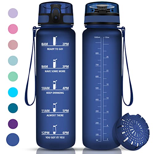 MAMEIDO dricksflaska 1l - kolsyra lämplig, läckagesäker dricksflaska med tidsmarkör som drickspåminnelse, vattenflaska BPA-fri för sport (Sapphire Blue, 1000ml)