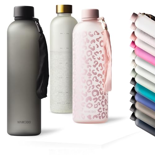 1 liter vattenflaska i glas med lock i rostfritt stål – 1 000 ml sportflaska med tidsmarkör, återanvändbar okrossbar silikonväska flaska för fitness, gym, utomhus, resor, träning (svart)