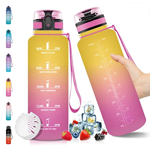 KollyKolla 1,5 liters vattenflaska, gym, motiverande flaska, sportflaska med tidsmarkör, läckagesäker, BPA-fri, vuxenvattenflaska, skola, gym, fitness