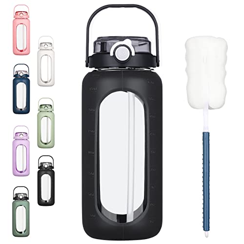 BLUEGO 60 oz glasvattenflaskor med sugrör tidsmarkör halv gallon stor motiverande vattenflaska med silikonhylsa stor glaskanna flaska för gym, sport, träning, daglig svart