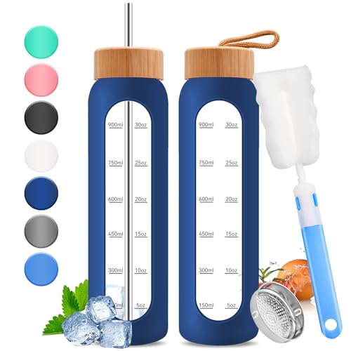 32 dl glasvattenflaska med tidsmarkör – 1 000 ml stor motiverande vattenflaska med 2 bambulock, förseglat och sugrörshål, 1 l flaska för fitness med sugrör i rostfritt stål och silikonväska (mörkblå)