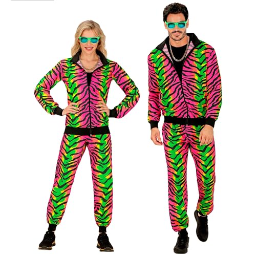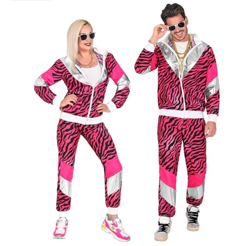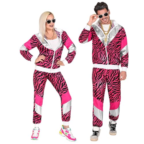 W WIDMANN MILANO Party Fashion – Kostym 80-talet träningsoverall tiger, lyser under UV-ljus, rosa, jacka och byxor, djurtryck, joggingdräkt, retrostil, badknapp fest, karneval