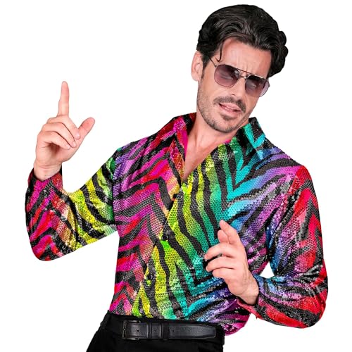 Widmann – Party Fashion paljettskjorta för män, regnbåge, tigermönster, disco fjäder, slagverk, herrskjorta