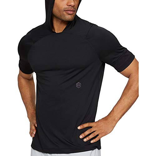 Under Armour UA Rush sport huvtröja för män, kortärmad gymkläder med skvättteknik, bekväm tröja med huva med tight passform Svart S