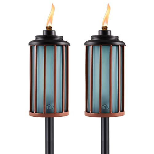 TIKI Märke 2-pack retro randigt glas lättinstallerad ficklampa, utomhus dekorativ belysning för gräsmatta uteplats trädgård, 152 cm, blå och koppar, 1122119