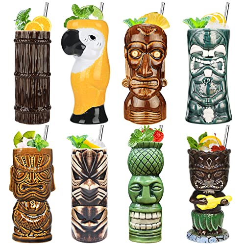 SuproBarware Tiki-mugg-set, 8-delat cocktailglas-set färgglada keramiska cocktailmuggar hawaiiansk festdekoration för exotiska fester