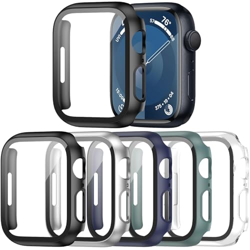 Haojavo 5-pack fodral kompatibelt med Apple Watch Series 9, 8, 7, 45 mm med skärmskydd i härdat glas, PC hårt ultratunt repbeständigt stötskyddande fodral för iWatch 45 mm tillbehör