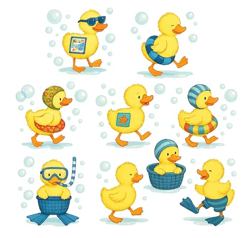 Söta anka väggklistermärken för badrum – 9 avtagbara vattentäta dekaler för barn badkar och barnkammardekoration – roliga gula ankungar med bubblor och tillbehör – 25 cm höga vardera