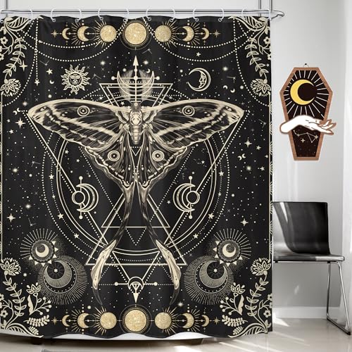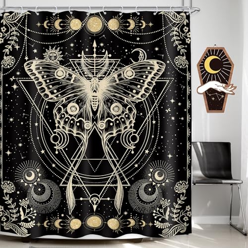 LGhtyro Guld Mal Duschdraperi 152 cm B x 180 H cm Månfas Badrumsset Gotisk Svart Fjäril Månbelyst Häxa Tarot Halloween Badkar Tillbehör Dekor för Tonåringar