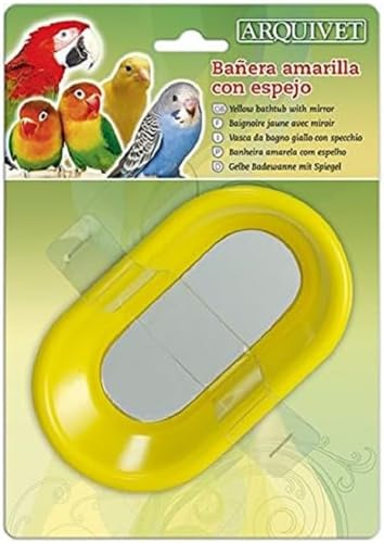 Arquivet gult fågelbadkar med spegel – 14,5 x 8,5 x 4,5 cm – badkar för kanariefåglar, undulater och andra fåglar – tillbehör och tillbehör för fågelburar
