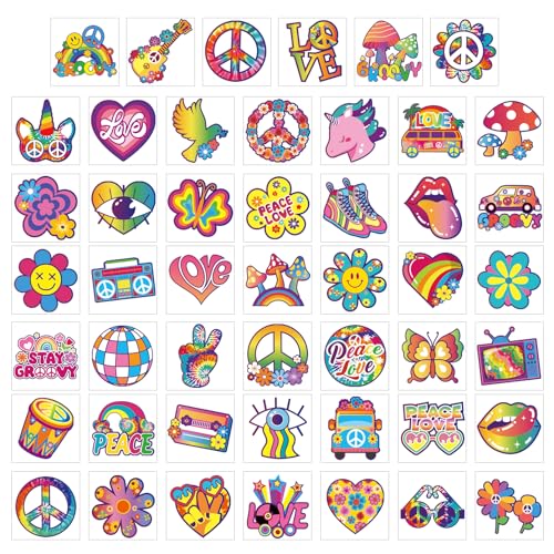 Qpout tal Glow In The Dark Hippie-Tatueringar klistermärken Groovy 70-80-90-talet tillfälliga tatueringar för barn, vattentät kärlek och fred lysande ansikts biograf power hippie party