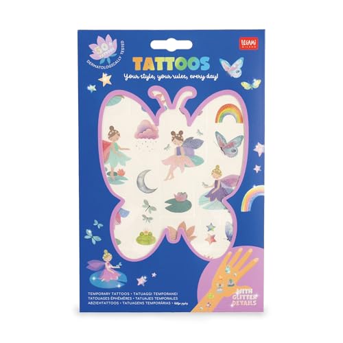 Legami – tillfälliga tatueringar för barn, fairy-tema, tvättbar, svett- och vattentät, med glitterdetaljer, lätt att applicera, hudvänlig, dermatologiskt testad