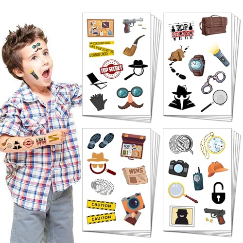 Lcnjscgo 20 ark hemlig agent spiondetektiv tillfälliga tatueringar, mysteriedetektiv ledtråd fest gynnar tillbehör dekorationer spionspel kit för barn pojkar
