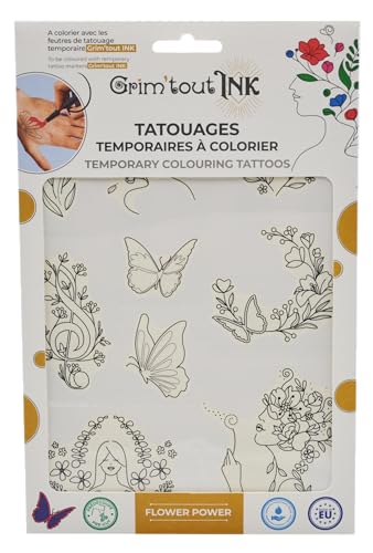 GRIM'TOUT – Tillfälliga tatueringar att färga – Flower Power – Bohemiska blommönster – Kreativt kit för barn och vuxna