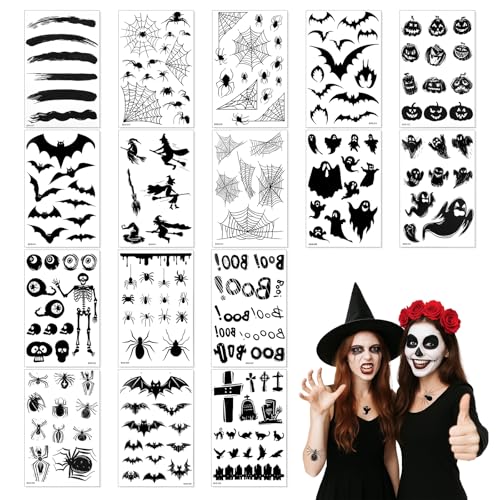 16 Ark Halloween Tillfälliga Tatueringar, Spindelnät Spindel Fladdermus Pumpa Ansikte och Kropp Tatueringsklistermärken för Vuxna Barn Halloween Fest Cosplay