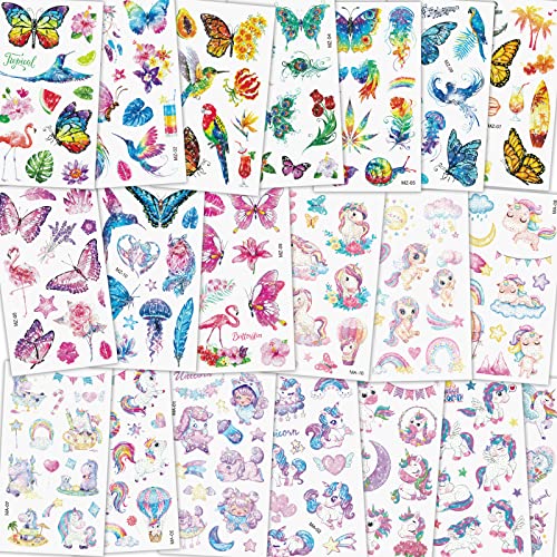 ACWOO tillfälliga tatueringar för barn, 20 st Unicorn + Butterfly glitter tatueringar för barn, vattentäta, avtagbara tecknade tatueringar klistermärken för flickor Festväskor, födelsedag, presenter