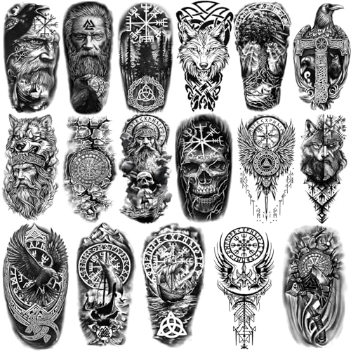 77 ark tillfälliga tatueringar för vuxna och barn, vattentäta falska tatueringar, 17 stora och 60 små svarta tatueringsklistermärken, nordisk vikingatatuering design