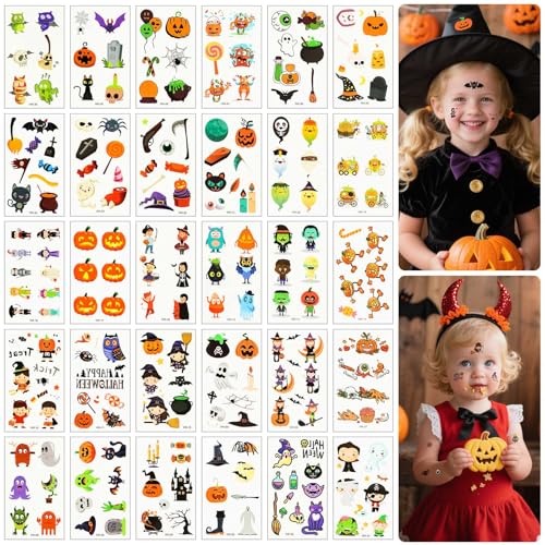 Alaoo Tillfälliga Halloween-tatueringar, 30 ark tillfälliga tatueringar barn halloween, tecknade tatueringar, för halloweenfestdekoration, barngåvor B