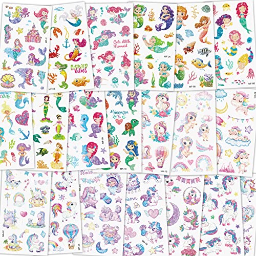 ACWOO tillfälliga tatueringar för barn, 20 st sjöjungfru + glittertatueringar av enhörning, vattentäta, avtagbara tecknade tatueringar för flickor.