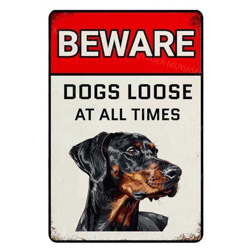 MUYIASER 'Beware Of Dogs Loose At All Time' skylt Doberman varningsskylt aluminium metall plåtskyltar utomhus gårdsskylt varningsskylt för staket gård hem kök gård trädgård väggdekor 20 x 30 cm
