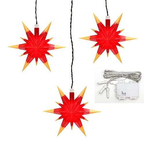Dekohelden24 Uppsättning av 3 julstjärnor av plast i röd/gul, inklusive LED-belysning och 6 h timer, för batteridrift, lämplig för inomhus- och utomhusbruk. Mått per stjärna L/B/H: 13,5 x 5,5 x 12 cm.