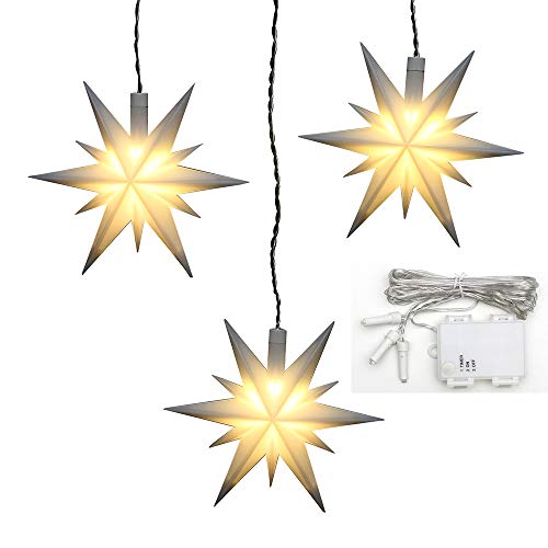 Dekorhjälte24 set med 3 julstjärnor av plast i vitt, inklusive LED-belysning och 6 timmars timer, för batteridrift, lämplig för inomhus- och utomhusbruk. Mått per stjärna L/B/H: 13,5 x 5,5 x 12 cm,