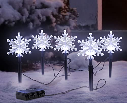 Spetebo LED-trädgårdskontakter, uppsättning med 5 snöflingor med timer – 21 cm H – trädgårdsdekoration belysning kall vit – jul adventsvinter, snö, stjärna, ljusstavar för utomhusbruk, batteri