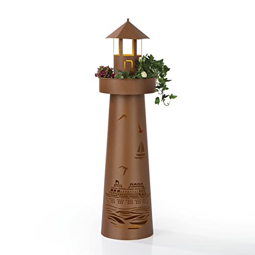 Hoberg LED-växtpelare i fyrtorndesign och maritim stansning i rostutseende | för inomhus- och utomhusbruk | med LED-belysning, 6 timmars timer, trådlös | individuellt planterbar plattform [ø 21 x 80