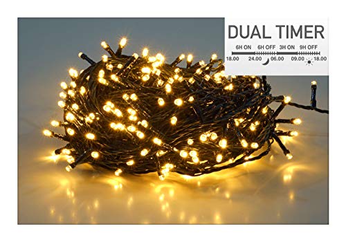 LED-ljuskedja varm vit med dubbel timer – 120 lysdioder/9 m – julbelysning för inomhus- och utomhusbruk – adventsvinter trädgårdsdekoration med timer för morgon-/kvällsbatteri