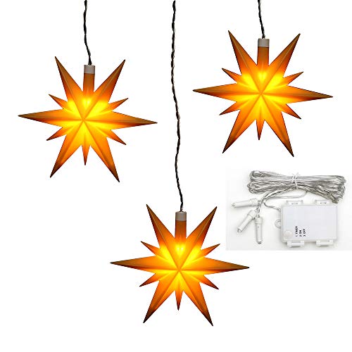 Dekohelden24 Uppsättning av 3 julstjärnor av plast i gult, inklusive LED-belysning och 6 timmars timer, lämplig för batteridrift, inomhus- och utomhusbruk, mått per stjärna L/B/H: 13,5 x 5,5 x 12 cm.