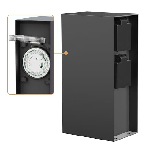 Wiltec Dubbel trädgårdsuttag – 2 uttag – 155 x 155 x 405 mm – design energipelare – stål – med mekanisk timer – utomhusbruk IP44 utomhus