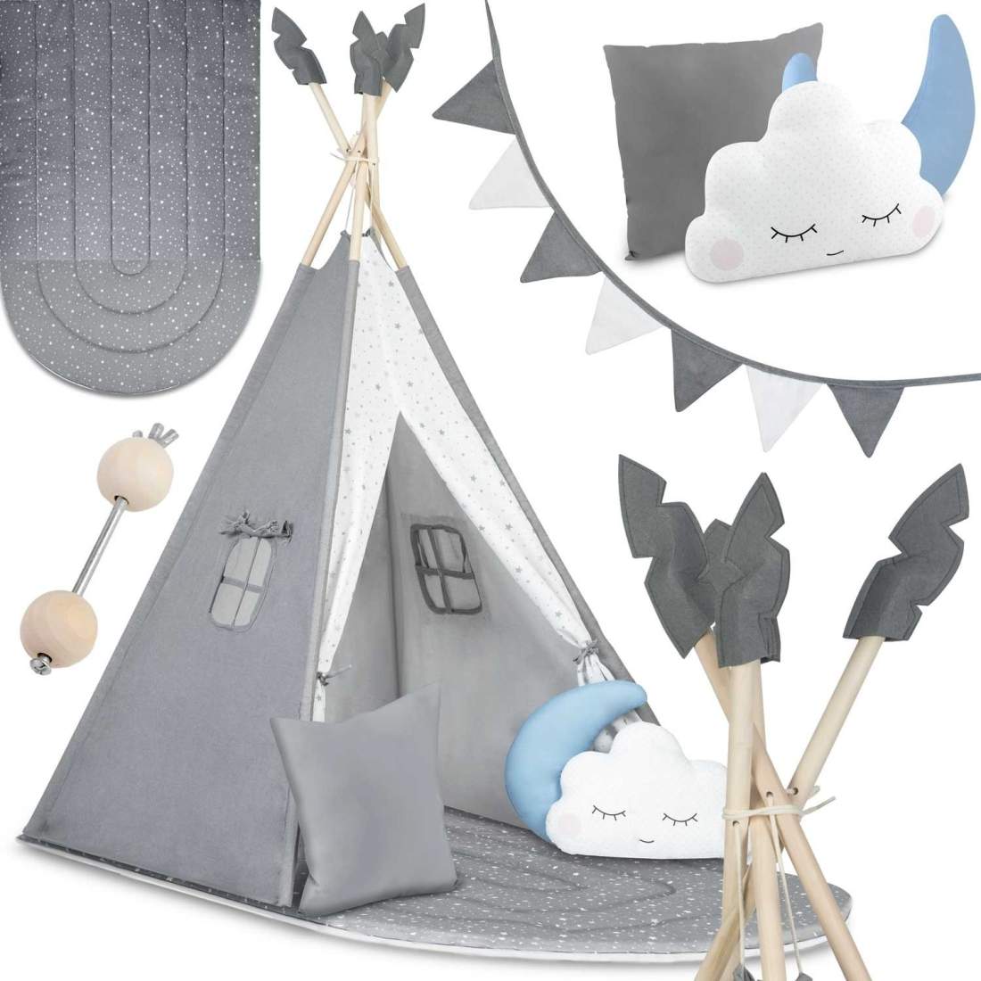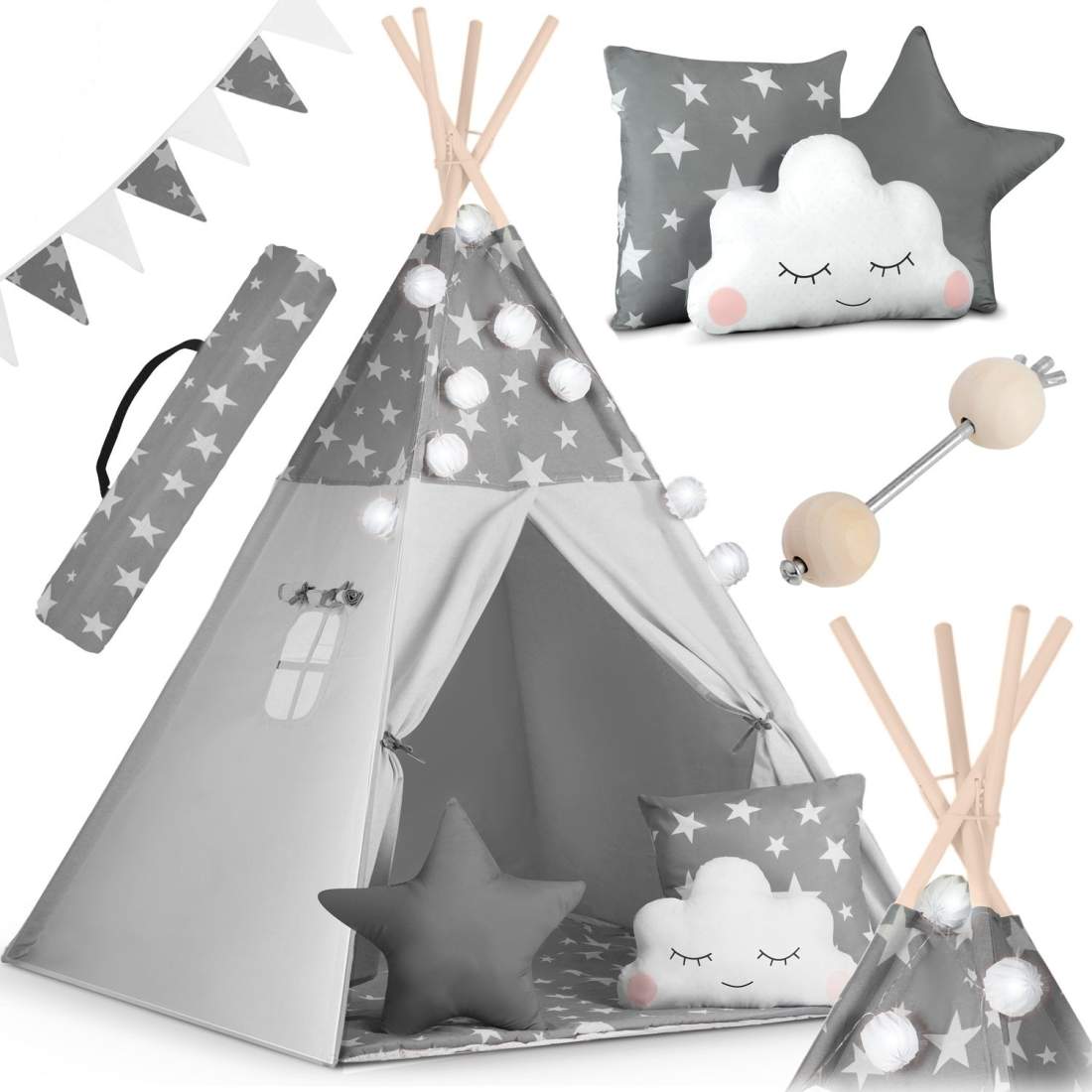 Tipi-tält för barn med girlang och ljus - grå