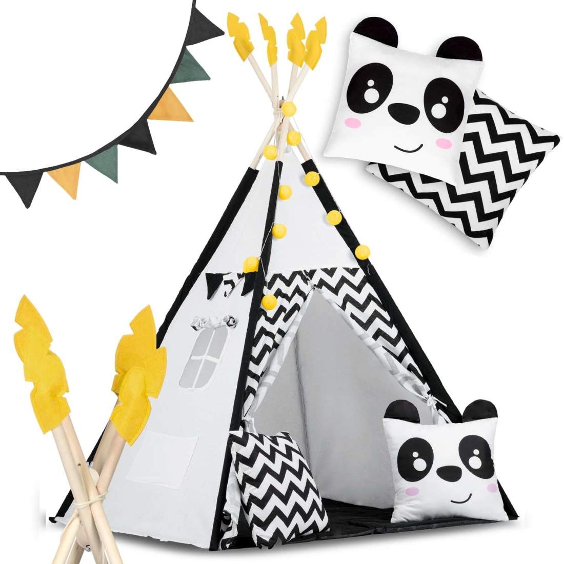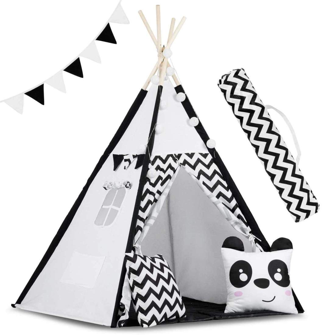 Tipitält för barn med krans och lampor Nukido, svart och vitt med en panda