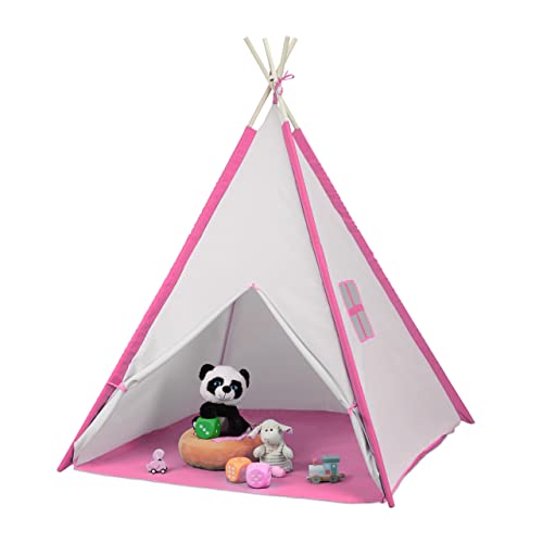 Relaxdays lektält, Tipi-tält för barn, med golv, barnrumstält, HBT: 154 x 124 x 124 cm, barntält, vit/rosa